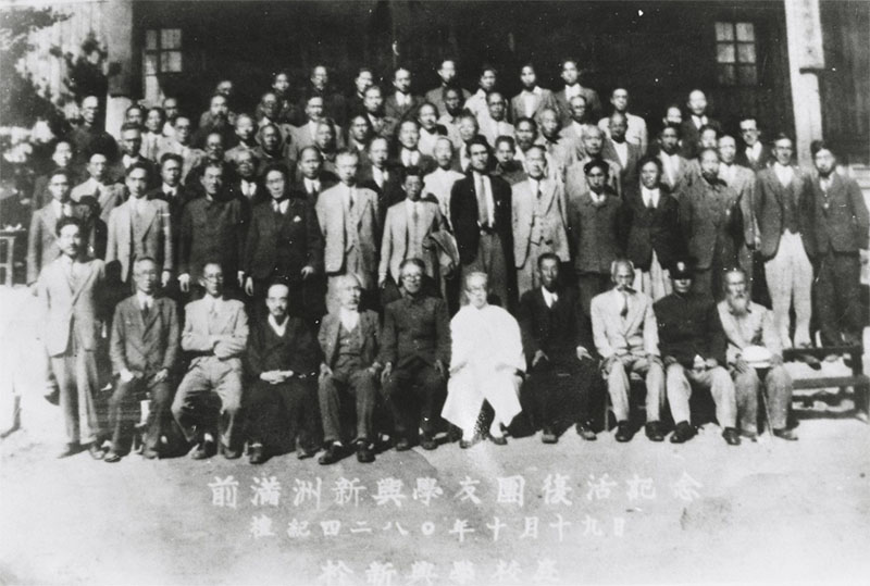 ▲ 광복 후 신흥무관학교 출신 들이 신흥학우단을 복원하고 성재 이시영 선생(중앙의 흰 옷)과 함께 하였다. (우당기념관 제공)