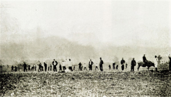 ▲ 백두산 서쪽 기슭에 백서농장과 병영을 건설하고 농업과 군사훈련을 받던 신흥무관학교 학생들 (신흥무관학교기념사업회 제공)