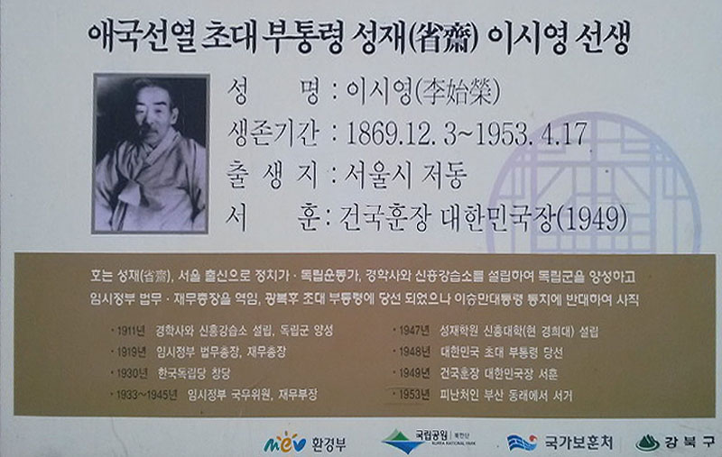 ▲ 삼각산(북한산) 기슭, 순국선열 순례길 구역의 이시영 선생 묘역 안내판